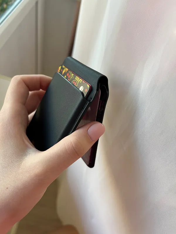 Приятный материал, не остаются отпечатки пальцев, сильный магнит- хорошо держится на телефоне. Карманы плотные, карты не выпадают, ну и телефон теперь всегда можно в любом месте поставить без проблем для просмотра роликов и видеозвонков, очень удобно.