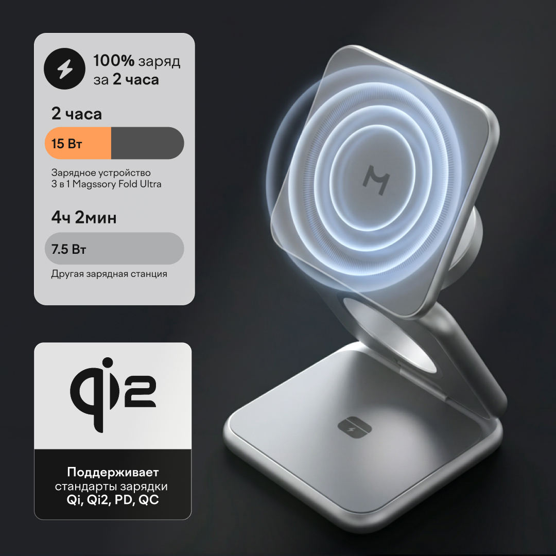 - Поддержка Qi, Qi2, PD, QC, совместимость с MagSafe